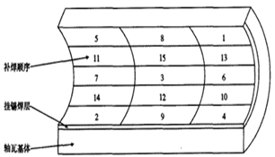 多層多道補(bǔ)焊。補(bǔ)焊順序見圖示。4)補(bǔ)焊軸瓦合金每一層每一道都要清理,用白布輕擦干凈。5)堆焊時(shí)一定要使弧坑填滿、緩慢收弧,以免產(chǎn)生氣孔及裂紋。6)補(bǔ)焊軸承合金要留夠加工余量,最后一層焊道要比軸瓦原始表面略高,并注意在焊道與原始表面交界處避免咬邊和未熔合等缺陷。