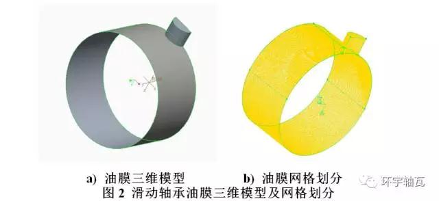 據(jù)上相關(guān)尺寸參數(shù),于Proe中繪制滑動(dòng)軸承油膜計(jì)算模型,考慮到軸承以及油膜潤(rùn)滑的對(duì)稱性,為縮減計(jì)算時(shí)間,模型僅繪制一半,如圖2a所示。
