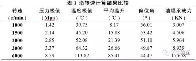 不同轉(zhuǎn)速仿真實(shí)驗(yàn)中,軸瓦內(nèi)孔100mm、寬徑比為1,潤(rùn)滑油入口油溫27℃,偏心率、直徑間隙等參數(shù)為定值,設(shè)定不同的主軸轉(zhuǎn)速,其計(jì)算結(jié)果數(shù)據(jù)如表1所示。據(jù)此可知,隨著主軸轉(zhuǎn)速增加,油膜壓力極值及增大,溫度極值及溫升均顯著升高,偏位角逐漸變小,軸心有下移趨勢(shì),油膜承載能力也隨之增強(qiáng)。顯然,主軸轉(zhuǎn)速對(duì)油膜特性的影響規(guī)律與經(jīng)典軸承理論相吻合。