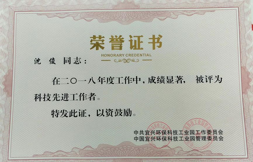 總經(jīng)理沈俊被中國宜興環(huán)??萍脊I(yè)園管理委員會評委“科技先進工作者”