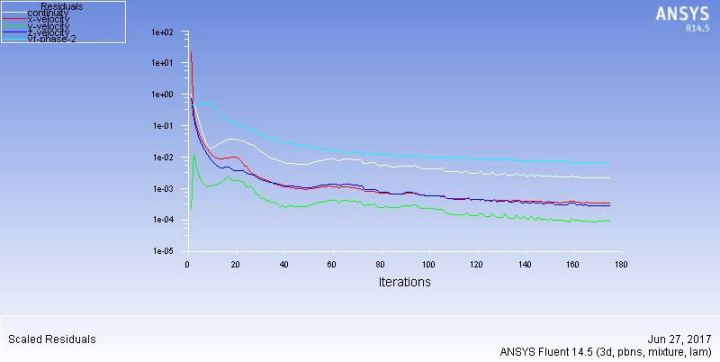 由殘差曲線圖,如圖3,170次迭代計(jì)算后,趨于收斂,表明網(wǎng)格模型質(zhì)量較好,求解設(shè)置相關(guān)參數(shù)準(zhǔn)確。