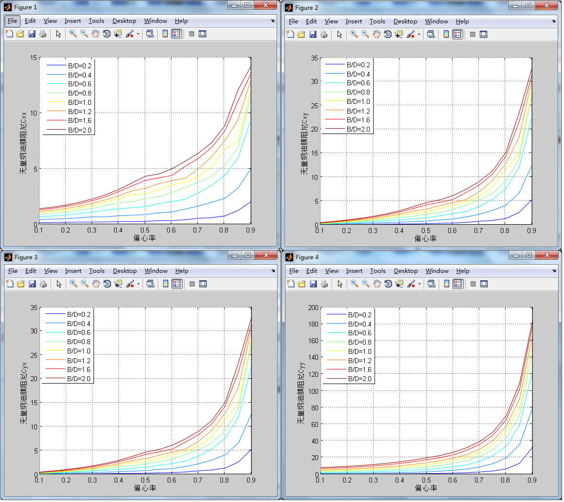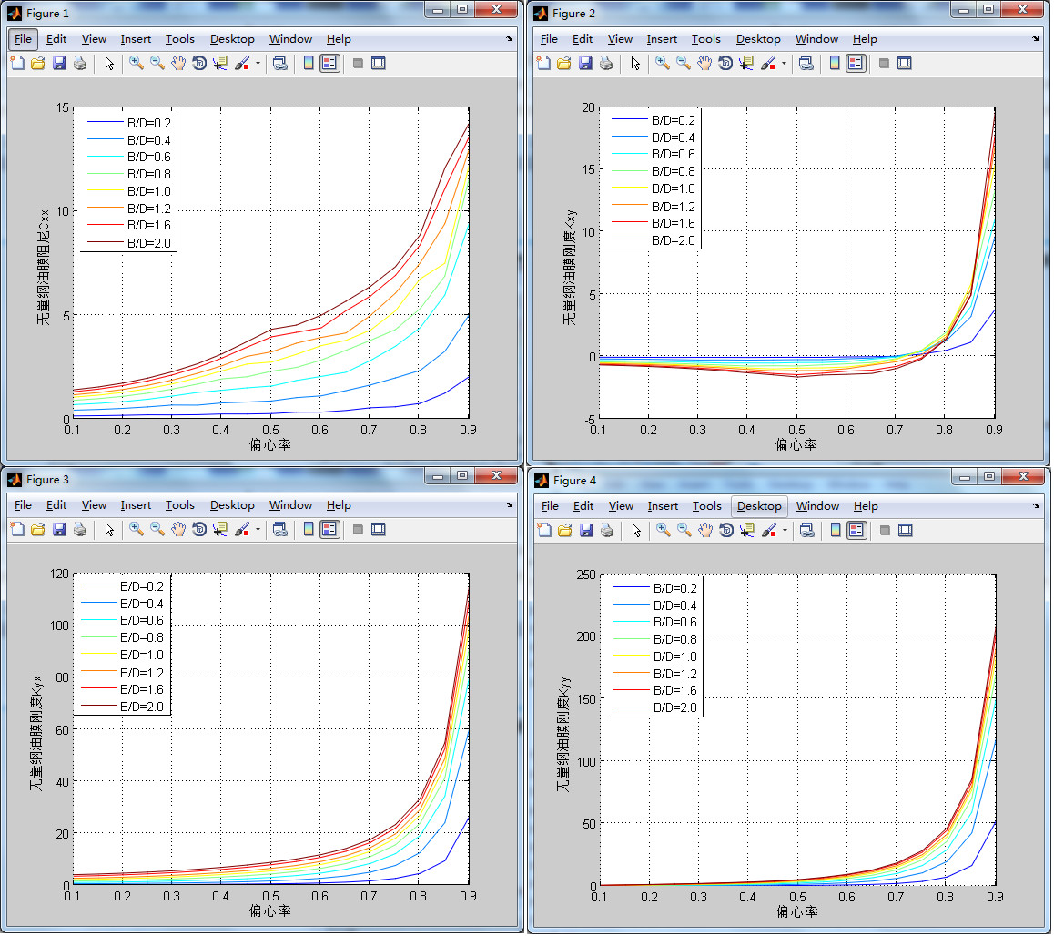 據(jù)上,用差分概念計算剛度、阻尼實質上是求解八次雷諾方程,借助Matlab數(shù)值計算軟件進行編程可計算出無量綱剛度系數(shù)阻尼系數(shù)。