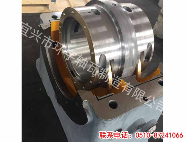 瓦塊上的銷釘孔設(shè)在違背基地7.54mm處,因而瓦塊的工作面和推力盤之間就構(gòu)成了楔形空隙。當(dāng)推力盤滾動時油在楔形空隙中遭到揉捏,壓力提高,因而這層油膜上具有接受轉(zhuǎn)子軸向推力的才能。裝置環(huán)安頓在球面座上,油通過節(jié)流孔送入推力軸承進(jìn)油室,分為兩路經(jīng)推力軸承球面座上的進(jìn)油孔進(jìn)入主軸周圍的環(huán)形油室,并在瓦塊之間徑向流過。在瓦塊與瓦塊之間留有寬敞的空間,便于油在瓦塊中循環(huán)。
